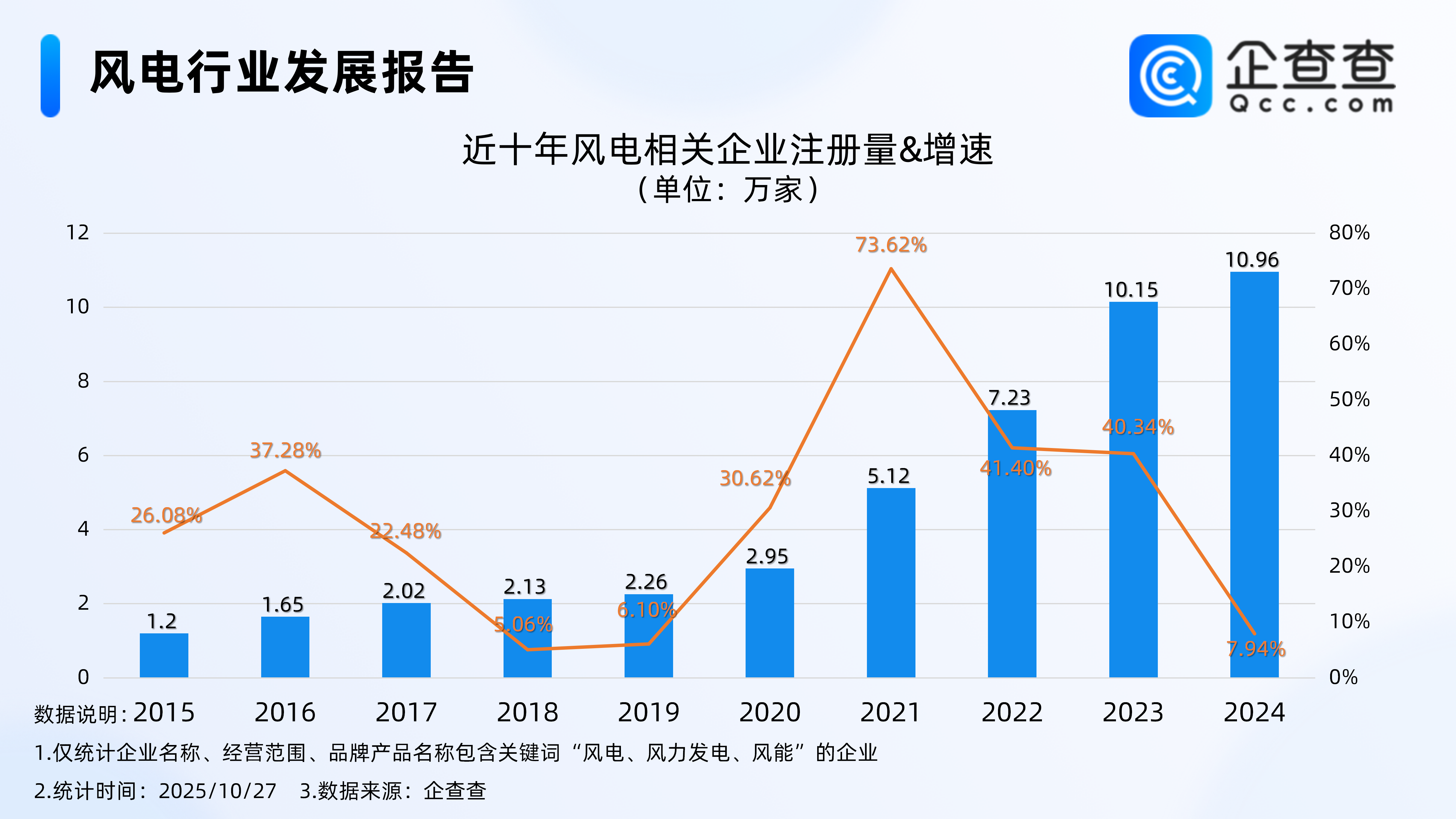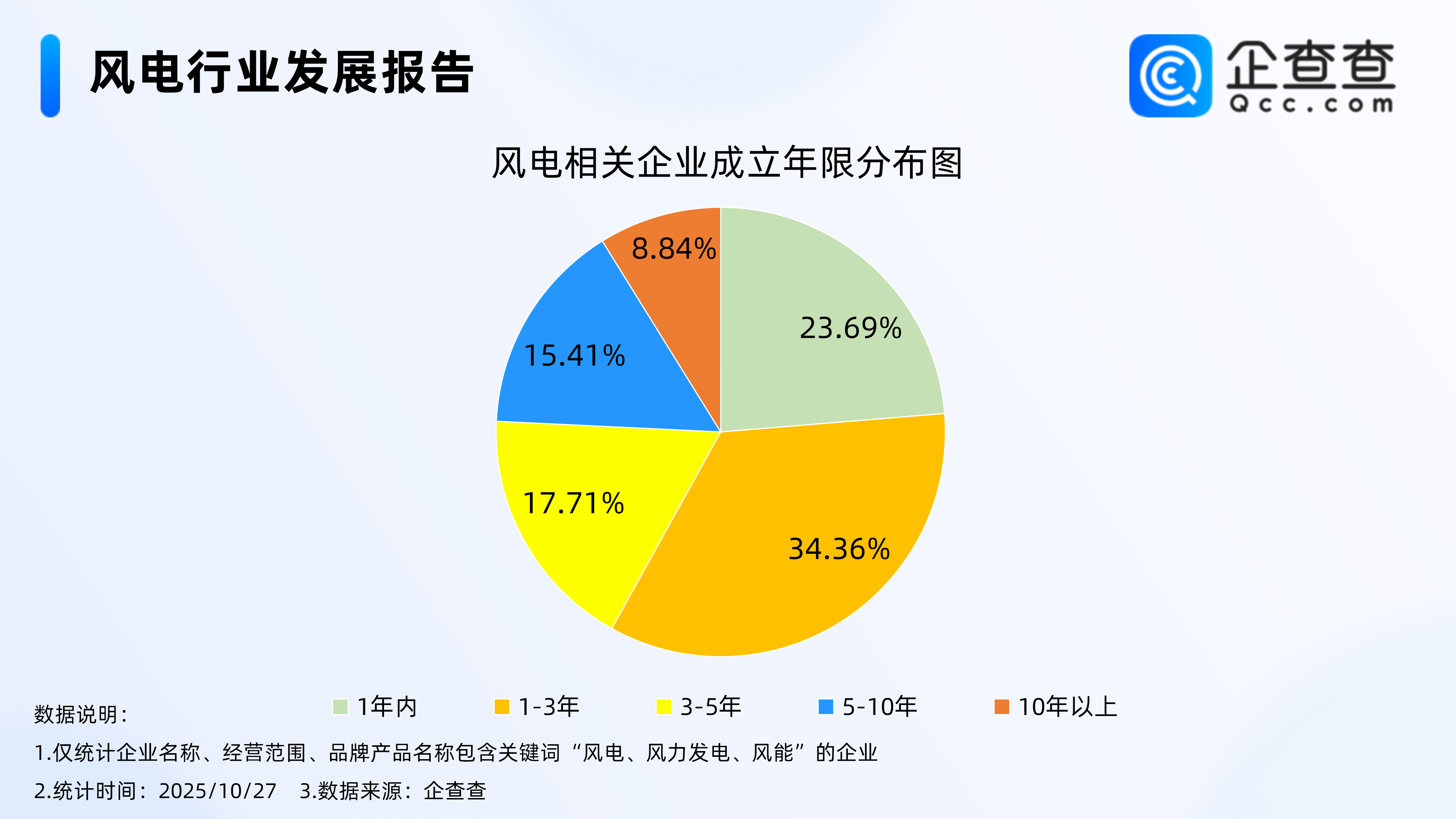 据央视报道,摩根士丹利发布研究报告显示,近年来,我国风机装机容量保持高速增长态势,2025年前7个月新增装机54吉瓦,预计全年新增约106吉瓦,“十五五”期间,年均新增装机容量将超过110吉瓦。2024年,我国风电产值全球占比达64%,中国制造的风机不仅大量供应国内市场,还出口到了50多个国家和地区。企查查数据显示,截至10月下旬,国内现存风电相关企业46.95万家。注册量方面,近十年风电相关企业注册量呈持续增长态势,2024年全年注册10.96万家相关企业,同比增长7.94%,创近十年注册量新高。截至目前,今年已注册9.11万家,其中前9月注册8.57万家,同比增长8.95%。从地区分布来看,今年新注册的风电相关企业多分布在华东地区,占比达29.29%。存量方面,从经营时间来看,风电相关企业多成立于近三年,成立年限在1-3年的相关企业最多,占比34.36%。1.现存风电相关企业46.95万家
